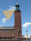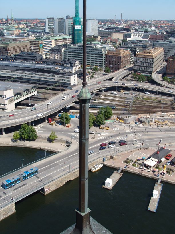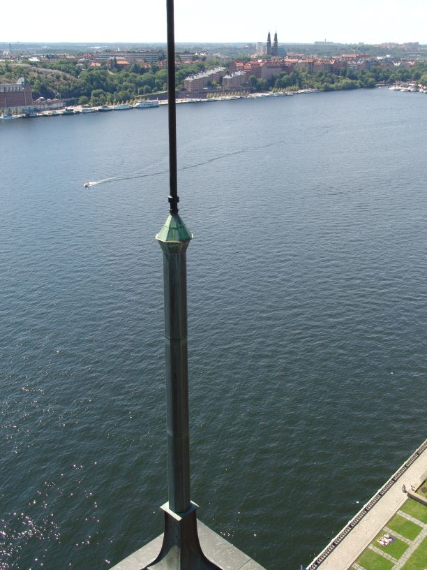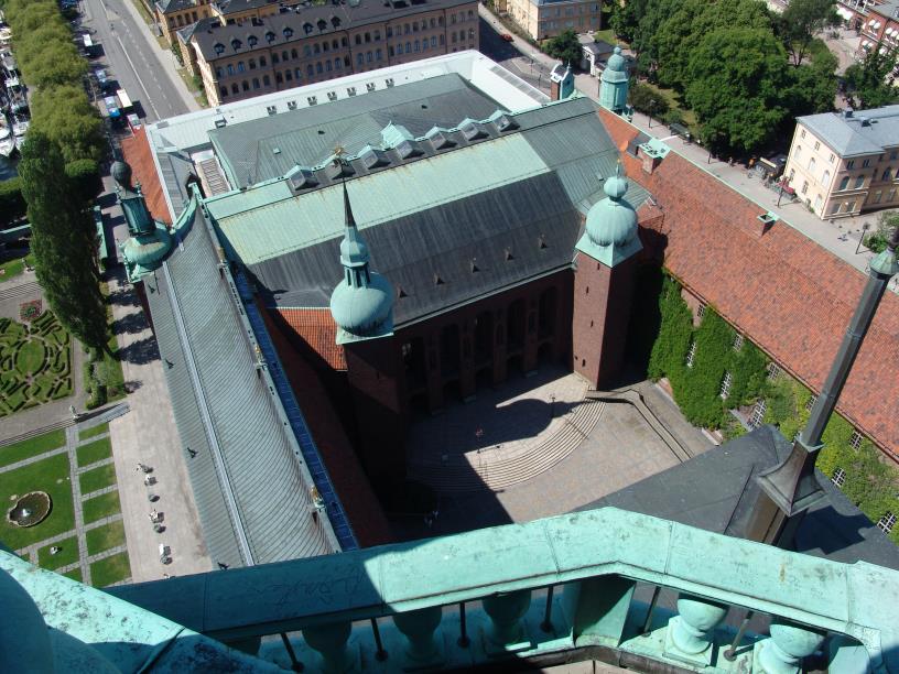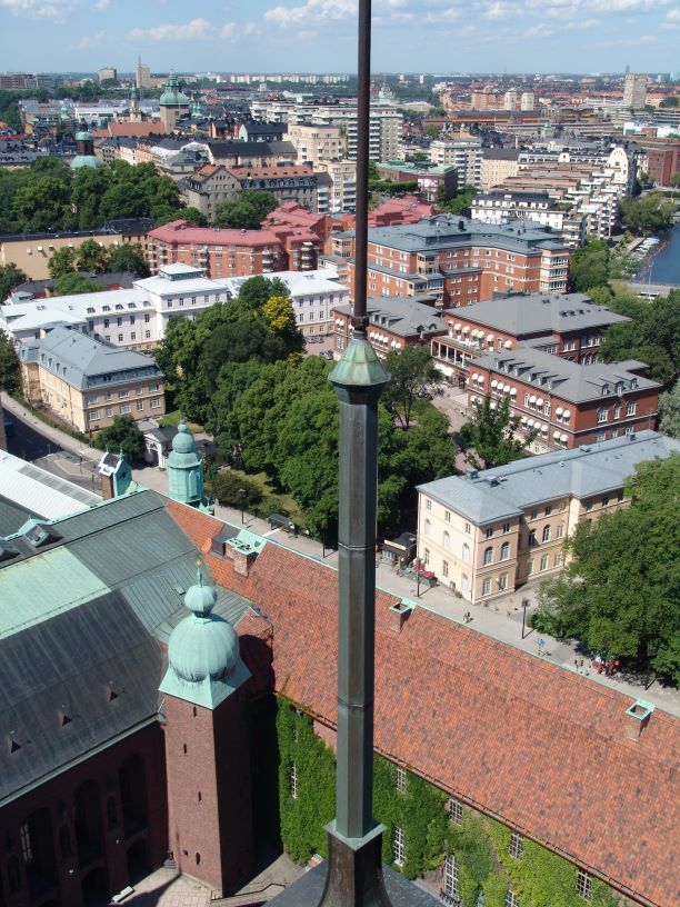 Desde lo más alto de la torre del ayuntamiento de Estocolmo comencé el proyecto. Para subir a la torre, de 106 metros de altura, cogí un ascensor y, una vez llegado a un poco más de la mitad de la torre, subí varios pisos por escaleras. Finalmente, recorres los últimos pisos por unos estrechos pasillos que dan acceso a la parte más alta de la torre, desde donde se pueden disfrutar de las vistas que se pueden apreciar en la panorámica.